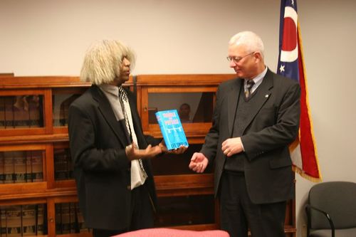 Marshall presents State Representative Jim McGregor with a copy of Lee Smolin's "The Trouble With Physics" at the commendation ceremony in McGregor's office.